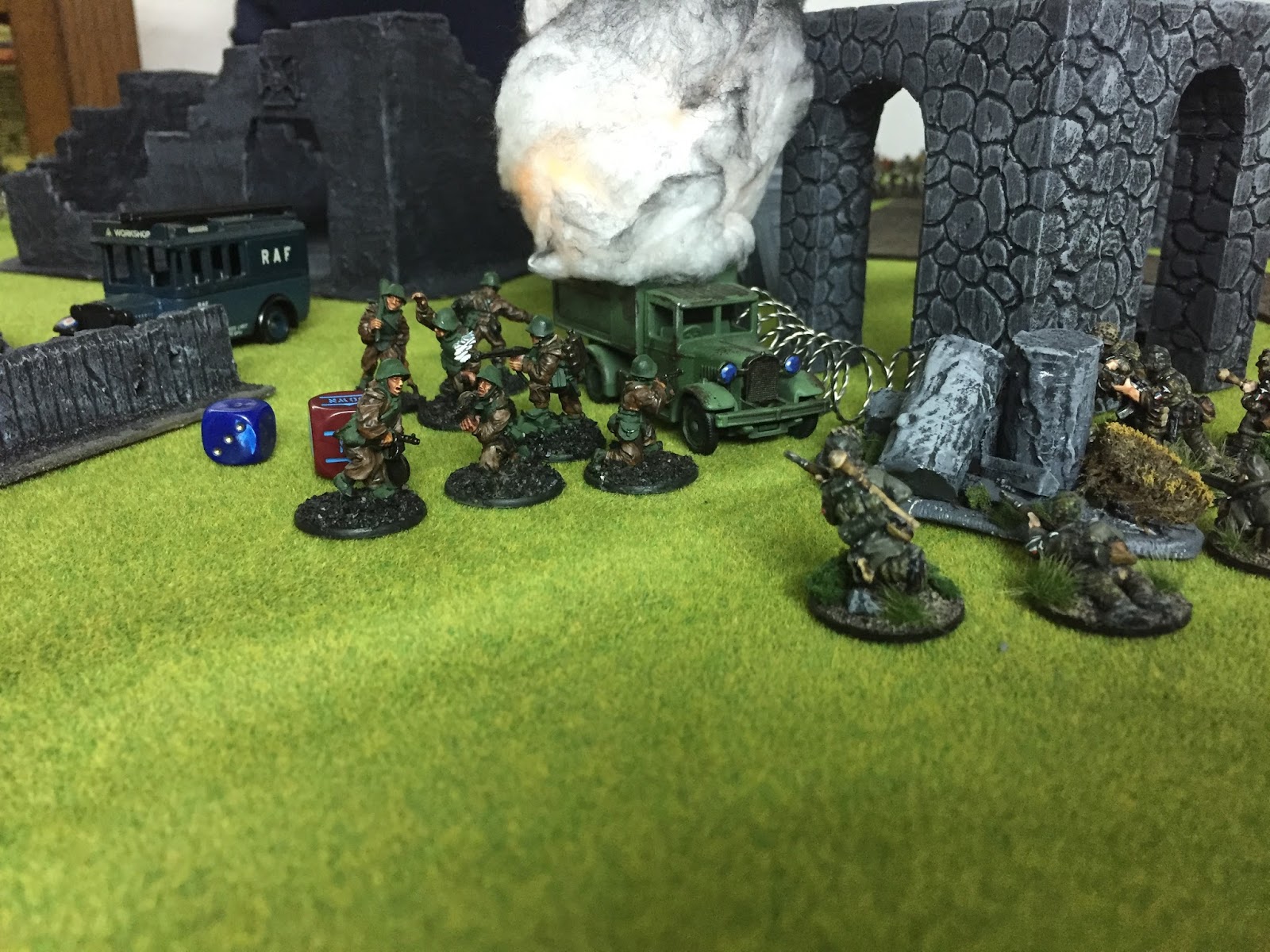 Szczęście ponownie się do mnie uśmiecha i wyciągam swoją kostkę jako pierwszy. Postanowiłem zaryzykować i spróbować strzelić SSmanami do syberyjczyków. Zdałem morale, ściągnałem PINa i kładę kostkę z rozkazem FIRE. Zabijam trzech, a to już 6 ataków mniej w close combacie. Znowu szczęście bo kolejna kostka moja, ale mam dylemat czy wybiegać flamerem i smażyć syberyjczyków albo równie niebezpieczny ampulomiot czy dokończyć dzieła zniszczenia wstrzelonym moździerzem, który prawie na pewno zabije tą śmieszną wyrzutnię. Decyduję się jednak wyskoczyć zza płotu miotaczem ognia i spalić syberyjczyków. Rzucam 5 hitów, ginie 4 ruskich, dostają 2 PINy, a potem nie zdają morale i uciekają, a ja mam pierwszą kostkę na przeciwniku.